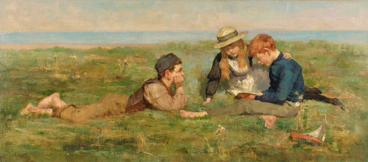 Crusoe (1890) shows two boys and a girl lounging in the grass, listening as the red haired boy reads aloud. The boys don’t wear shoes. A toy sailboat rests in the grass next to them. A body of water lies behind them.